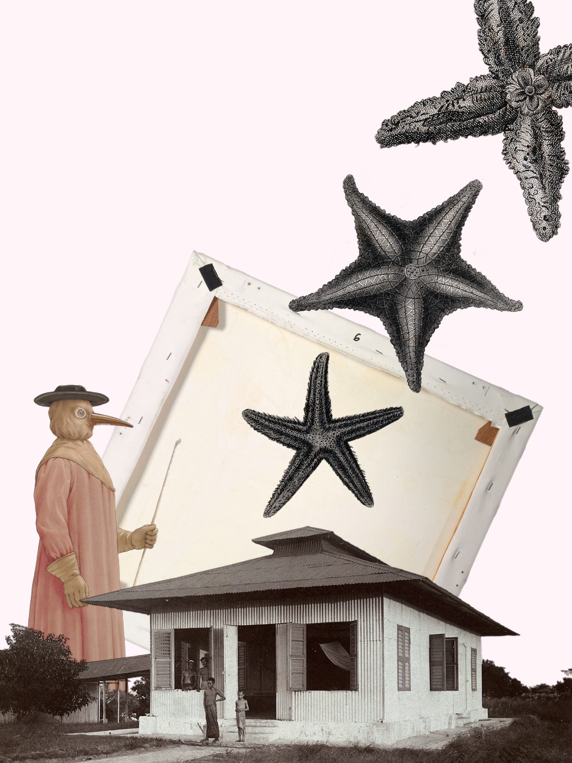 A collage intertwining sea stars, a house, and a masked figure, evoking a sense of mystery and the search for direction.