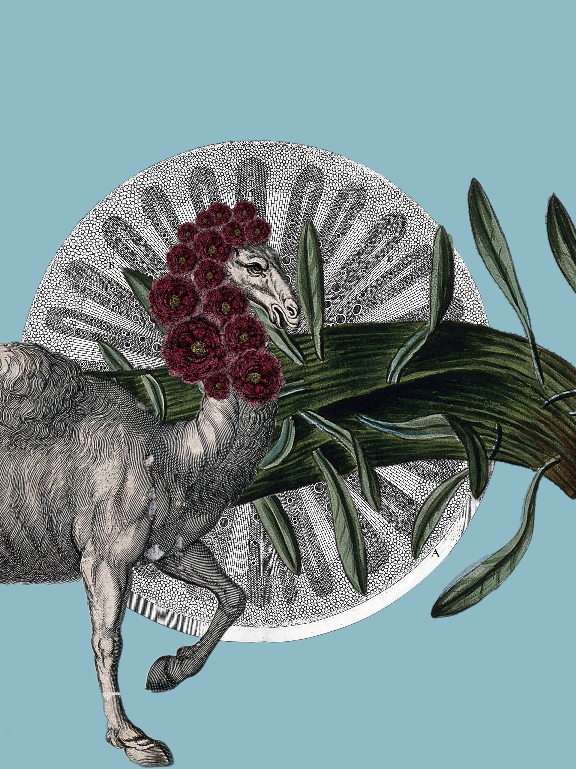 A collage where a sheep adorned with flowers instead of wool merges with botanical elements, offering a surreal interpretation of life and its beauty.