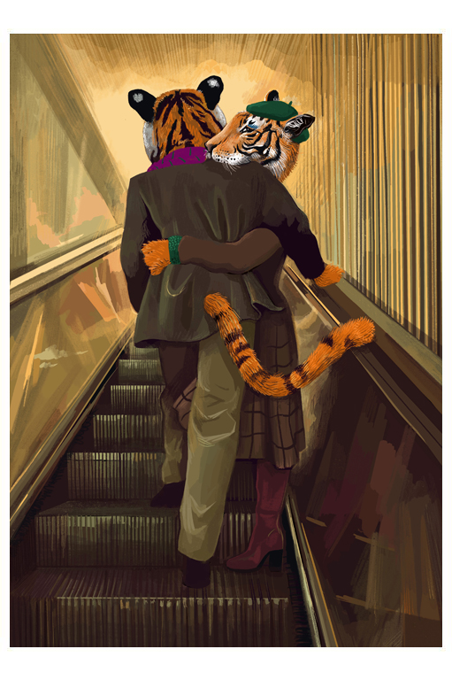 It’s as if we are neighbors on the escalator, able to ride further and follow this pair of tigers.