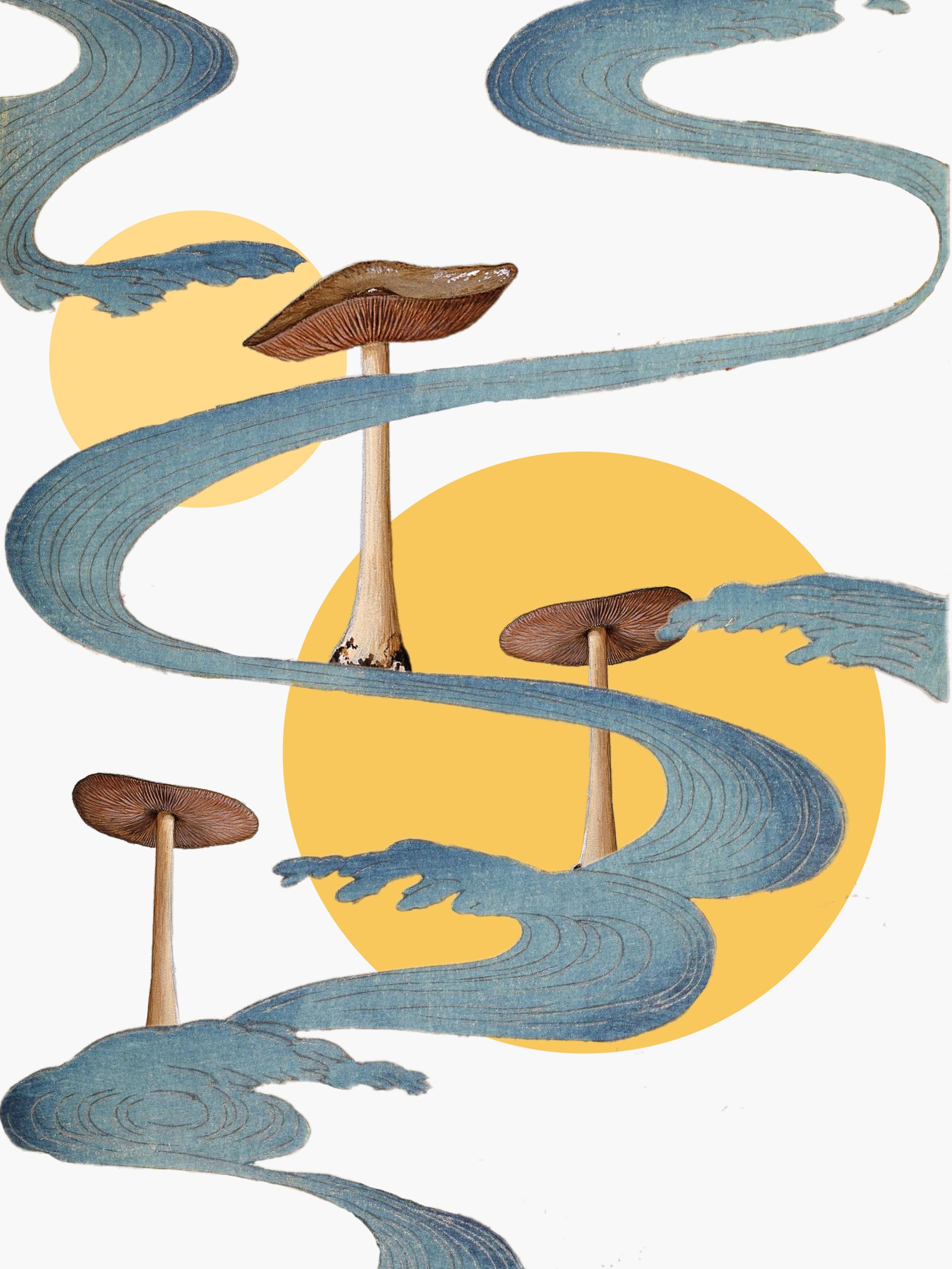 A collage where mushrooms emerge from flowing water, symbolizing the harmony of nature and the cycle of life.