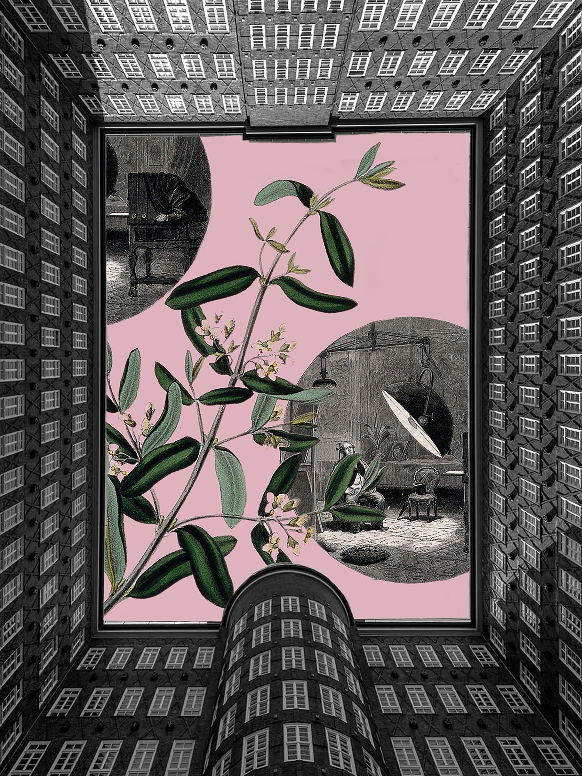 A collage where nature breaks through the geometric shapes of the city, reminding us of life’s resilience amidst urban landscapes.